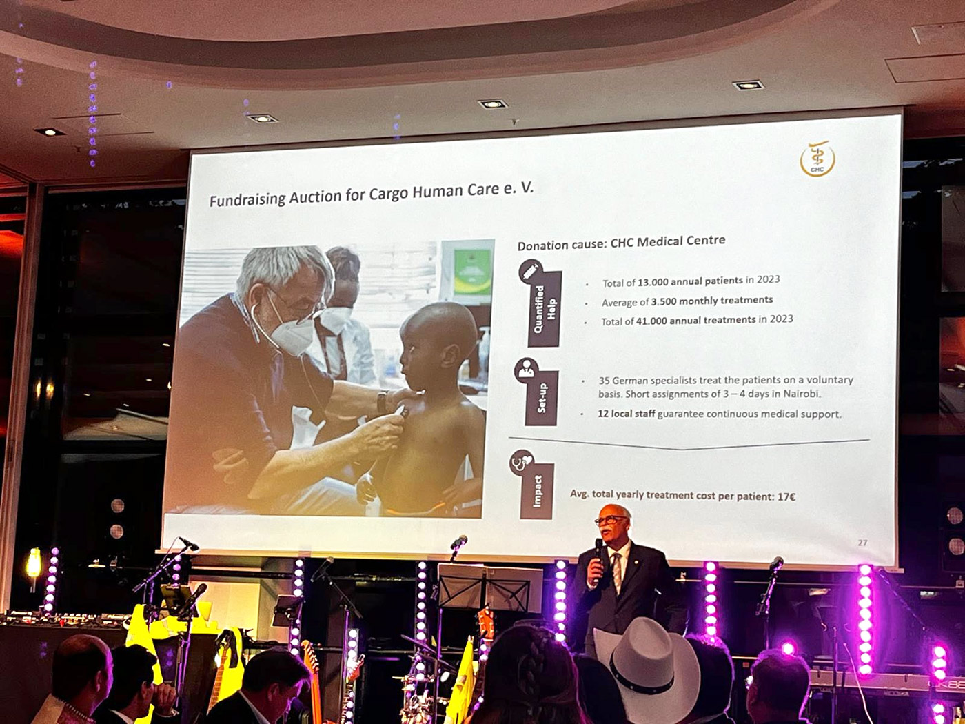 Die jeweils letzt bietende Person pro Auktionsrunde gewann den Preis. Nach Beendigung der Auktionen konnten wir Spenden von insgesamt über 5.000 EUR von hunderten Gästen verzeichnen. Anschliessend verdoppelte Finanzvorstand Frank Bauer diesen Erlös seitens der LH Cargo und inspirierte auch den Aufsichtsratsvorsitzenden Dr Niggemann zu einer weiteren deutlichen Erhöhung auf über insgesamt 15.000 EUR. Weitere Privatspenden an diesem Abend rundeten das tolle Ergebnis auf über EUR 17.000 ab. Mit diesem grossartigen Engagement der weltweiten LH Cargo Crew können wir nun 1000 Patienten ein Jahr lang behandeln.