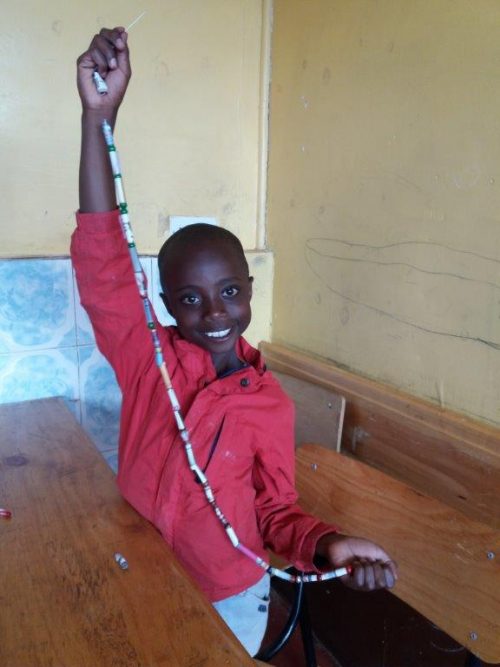 Großer Aufmerksamkeit und Beliebtheit erfreute sich auch der nächste Workshop. Es wurden Halsketten aus Katalogpapierstreifen und Holzperlen hergestellt. Das konnten sogar die ganz Kleinen erfolgreich fertigstellen. Mit sehr viel Eifer rollten sie die Papierdreiecke über einen Bleistift zu einer Perle und klebten die Enden fest. Die 18 Papierperlen wurden dann im Wechsel mit den Holzperlen aufgefädelt. Stolz wurden dann die Ketten zur allgemeinen Bewunderung vorgeführt.