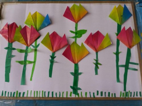Die aus dem ersten Faltvorgang entstandenen Blumen ordneten die Kinder in Eigeninitiative auf einem großen Blatt Papier an, fügten Stängel und Blätter hinzu und erarbeiteten damit eine schöne farbige Wanddekoration.