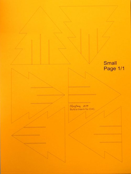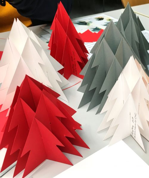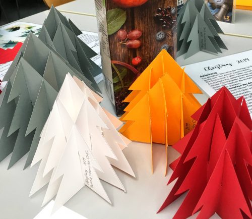 Bei gemeinsamen Treffen werden Weihnachtsbäume aus Tonkarton-Vorlagen ausgeschnitten und zu einem dekorativen, dreidimensionalen Tannenbaum zusammengesteckt. Gefertigt werden die Bäume in zwei Größen und fünf unterschiedlichen Farben. Materialpakete inklusive Anleitung werden zur Verfügung gestellt.
