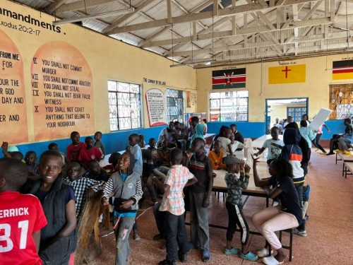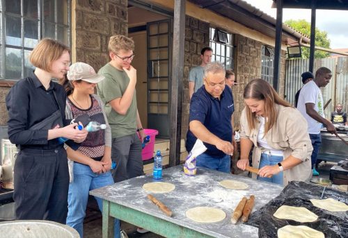 Gespannt reisten wir in einem kleinen Bus durch das morgendliche Treiben von Nairobi in Richtung Mothers Mercy Home. Dort angekommen begrüsste uns Charles, der Verantwortliche des Zentrums und die Sozialarbeiterinnen herzlich und zeigten uns anschliessend die Anlage. Im ersten Haus, welches wir besichtigen durften, lernten die Kinder Sprachen, Mathematik und Informatik. Mit freundlichen Blicken begrüssten uns die Jugendlichen, und zeigten uns stolz ihre Aufgaben. Danach führte uns Charles in die Küche, wo «Chapati», ein kenyanisches Fladenbrot, zubereitet wurde. Ashwin, bekannt für seine Passion zum Kochen, schmiss sich direkt hinter die Küchentheke und bereitete gekonnt ein eben solches Chapati zu. Nach dem Abstecher in die Küche begaben wir uns in den Garten, welcher von Avocado-Bäumen und Bananen-Palmen gesäumt war. Auch Kühe, Schweine und Hasen wurden gehalten. Lokale Landwirtschaft vom Feinsten, und die IWWG war das erste von vielen Malen beeindruckt. Anschliessend besichtigten wir die Schlafsäle der Kinder. Sie lebten sehr ordentlich und sauber, jedoch auf engstem Raum. Zum Schluss besuchten wir noch den zweiten Teil der Anlage, wo sich das Medical Center befand. Auch hier liess die Ordnung nicht nach: In einem Vorhof sassen geschätzt über 50 Leute Schulter an Schulter auf einer Bank und warteten geduldig auf ihren Termin. Beeindruckt waren wir vor allem, als uns ein Doktor erzählte, dass pro Tag über 100 Patienten behandelt werden, während in Deutschland maximal 20 Personen pro Tag versorgt werden.