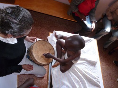 Ich bot Roberts an, mit ihm zu trommeln. Zunächst waren seine Schläge sehr zart; Roberts lockte ihn mit Worten und mit seinem Schlagrhythmus. Am Ende war es eine wunderbare Kommunikation von Auge zu Auge und Hand zu Hand. Erst dann konnte auch ich mit ihm Kräftigungsübungen praktizieren.