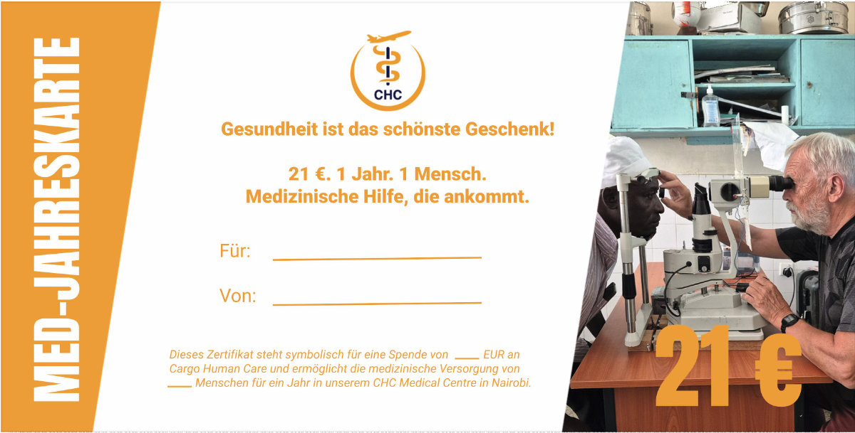 Mit der Med-Jahreskarte für 21 € ermöglichen Sie einem Menschen ein Jahr lang Untersuchungen, Beratungen und grundlegende medizinische Betreuung im CHC Medical Centre – zuverlässig und nachhaltig.