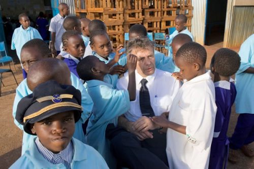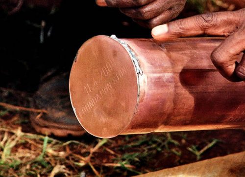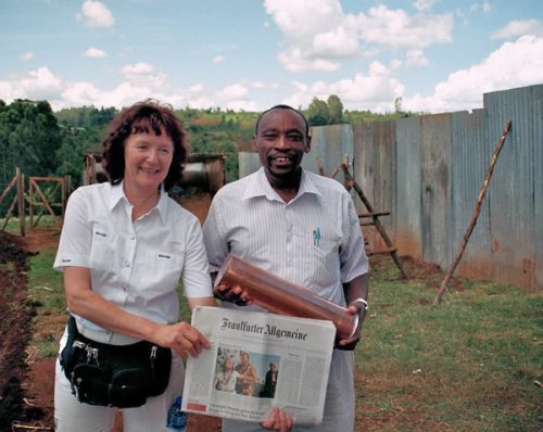 Gleich anschließend findet auf der Baustelle die feierliche Grundsteinlegung statt – die Kenianer sprechen hier von der „Ground-breaking ceremony“. Dr. Bausch hatte in Deutschland eine wunderschöne Metallkartusche herstellen lassen. Diese wird an Ort und Stelle mit einer aktuellen Ausgabe der FAZ, den Bauplänen, einigen kenianischen Münzen und einer Urkunde bestückt und verplombt. Die Kassette wird mit „vereinten Kräften“ in ein kurz zuvor ausgehobenes tiefes Loch befördert, genau an der Stelle, an der Ende des Jahres eines der beiden Arztzimmer unseres Cargo Human Care Medical Centres in Betrieb gehen soll. Eine deutsche Sitte, die allem Anschein nach erstmals auf kenianischen Boden stattfindet!