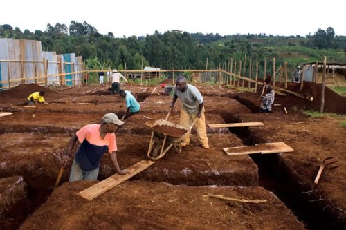 Die Auswahl der Baufirma wurde erst vor wenigen Wochen abgeschlossen. Dr. Corinna Röhricht hat unterstützt von Sieglinde Reinhard und Kerstin Wientzek in mühevoller Kleinarbeit sieben Angebote von Baufirmen, die an der Ausschreibung teilgenommen hatten, durchgearbeitet. Die Wahl fiel auf die Firma Kimanga Contractors aus der näheren Umgebung des Heims. Drei Tage vor der Grundsteinlegung begannen die Bauarbeiten auf dem Nachbargrundstück des existierenden Waisenheims. Aktueller Stand am 11. April: Ein Bauzaun umgibt das ganze Gelände, Unterstände für die Baumaterialien und Gerätschaften sind aufgestellt und die Fundamente sind bereits ausgehoben.