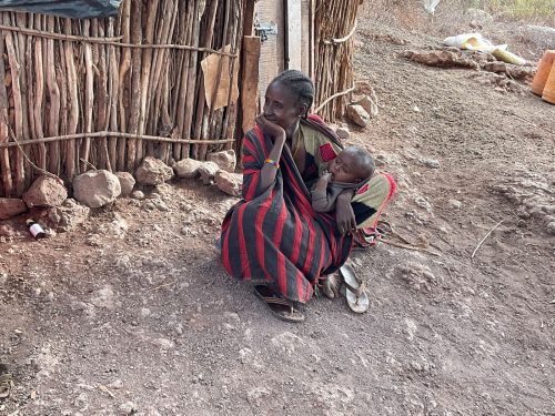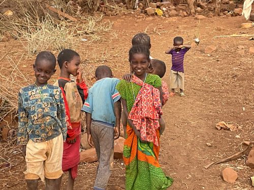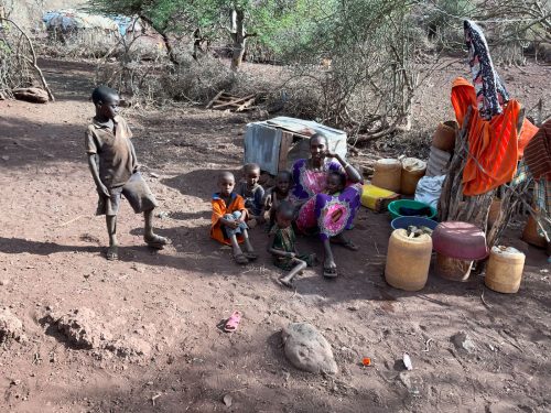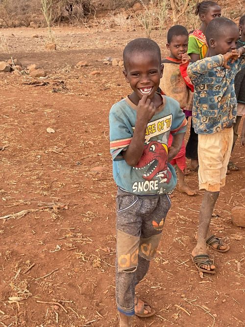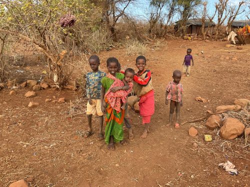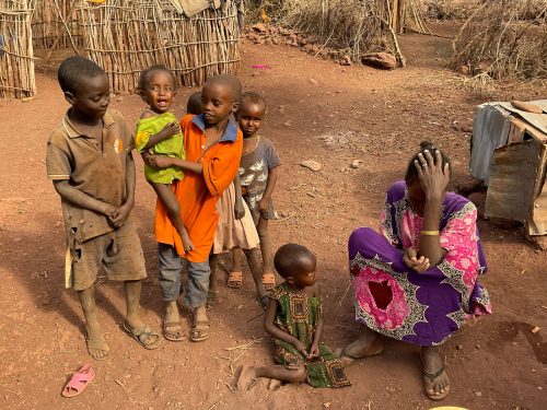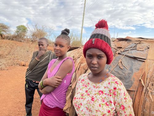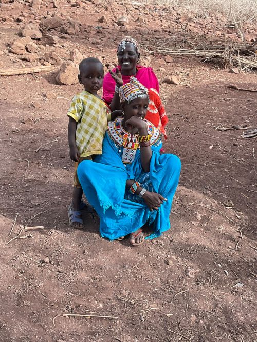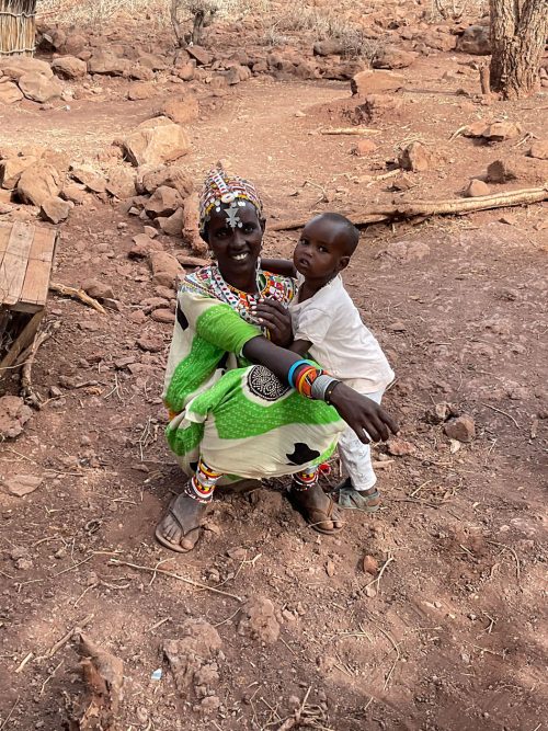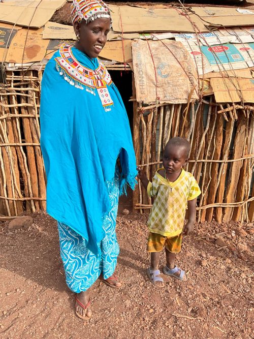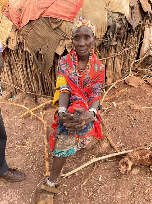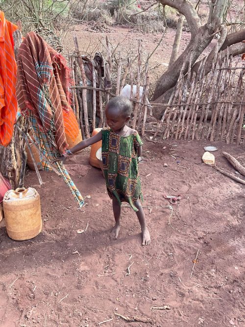 Jacqueline eine Mutter, lebt mit ihren zehn Kindern in typischen Hütten der Rendile (Rendille (Ethnie) – Wikipedia). Der Stall ist leer, von den ursprünglich 50 Ziegen lebt nur noch eine, die sich von Spreu ernährt. Diese Ziege wird vermutlich auch bald verhungern. Auf die Frage, warum sie ihre Ziegen nicht vorher verkauft habe, antwortet sie, dass sie immer auf Regen gehofft habe, der seit drei Jahren nicht mehr gekommen ist. Da es kein Vieh mehr gibt, fehlt auch die Milch für die Kinder. Die jüngeren Kinder sind unterernährt. Zahlreiche Kinder haben eine Pilzinfektion am Kopf. Die medizinische Versorgung scheint nicht ausreichend zu sein, für Medikamente fehlt das Geld. In der dunklen Hütte befinden sich eine kleine Küche, sowie ein Schlafzimmer für Eltern und Kinder. Ein kleines Mädchen wirkt traurig und hält sich abgesondert von ihren Geschwistern auf. Es gelingt mir nicht, sie zum Lächeln zu motivieren. Die finanzielle Situation der Familie ist verzweifelt. Ohne Nahrungsmittelunterstützungen würden die Kinder vermutlich stärker unterernährt sein.