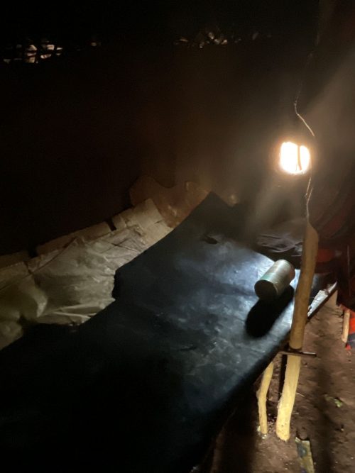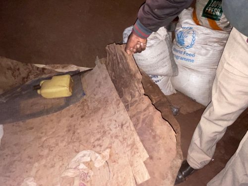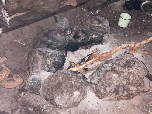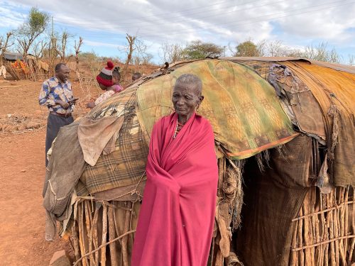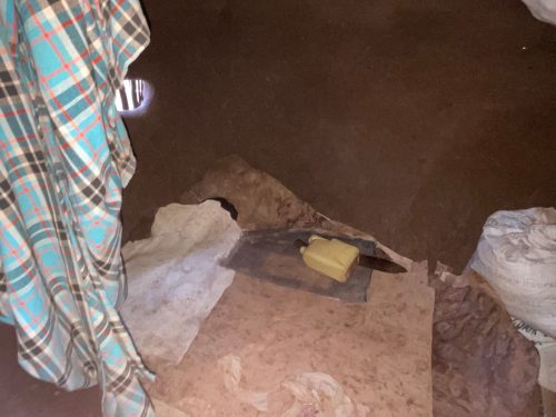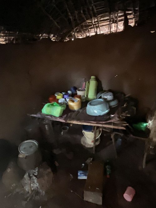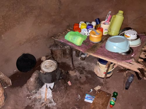 Wenige Schritte weiter treffe wir eine andere Familie, Eine 80-jährige Großmutter sitzt in der späten Nachmittagssonne mit ihren Töchtern und Enkelkindern vor ihren Hütten. Im Stall finden sich noch drei Schafe. Mehr ist der Familie nicht geblieben. Die Großmutter zeigt mir ihrer Hütte. Sie besteht aus einer Küche, einem Schlafplatz und einem Stauraum, der leer ist. Vor dem Schlafplatz brennt ein kleines Holzfeuer, daneben steht eine Schüssel mit frisch geschlachtetem Fleisch, das von einem verendeten Schaf stammt. Eine ihrer Töchter bedankt sich für die Nahrungsmittelunterstützung und für die Förderung und Unterstützung ihrer Tochter in der Wings Academy.