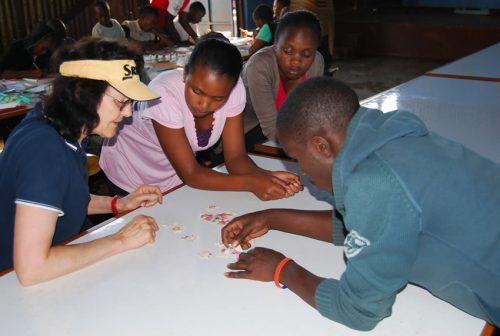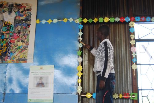 Mit der Gruppe der anwesenden 7-jährigen Kinder sowie am Nachmittag, nach Rückkehr von den Nachhilfestunden auch mit den größeren Jugendlichen wurden an allen Tagen verschiedene Bastelarbeiten mit Schere und Papier, Buntstiften und Kleber gefertigt. Fleißig wurde ausgeschnitten, gefaltet, geflochten, entworfen und geklebt. Zwischendurch gab es zur Entspannung kurze Ballspiele und es wurde zusammen gesungen. Alle Bastelarbeiten wurden von einem Jugendlichen in der Common Hall an den Wänden verteilt, so dass diese schön mit nach-österlichem Schmuck dekoriert werden konnte.