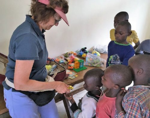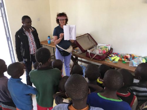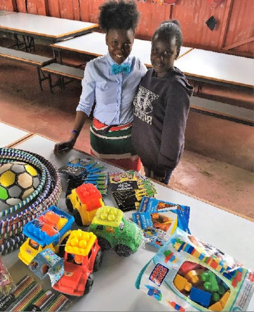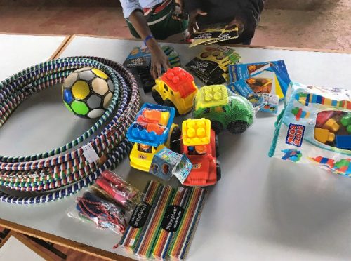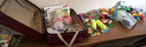 die Schule hatte über 800 EUR gesammelt und bereits einen Koffer voll Geschenke mit Bällen, Puzzeln, Spielzeug-Autos, Malbüchern und Duplo-Steinen selbst besorgt.