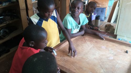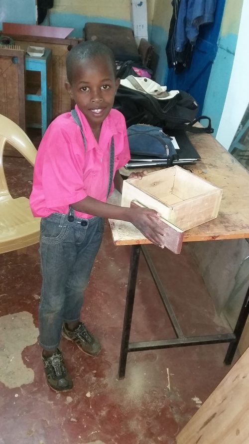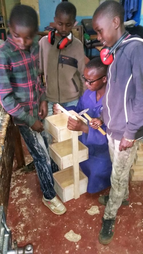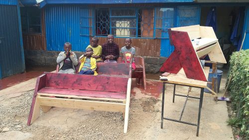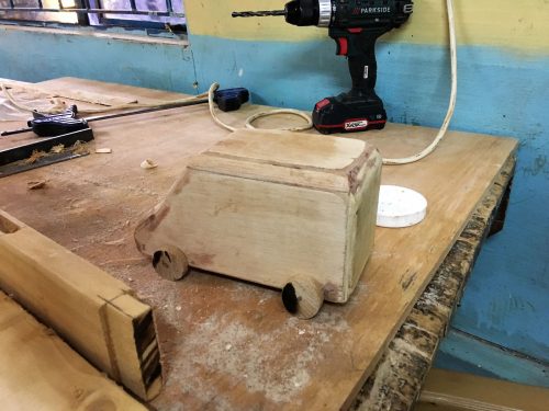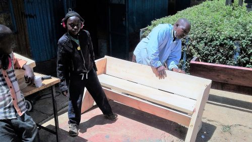 In der Holzwerkstatt wurden auf Anregung eines Arztes und mit Hilfe seiner Spende anlässlich seines Geburtstags sechs robuste Bänke nach einem relativ einfach nachzubauenden Entwurf gefertigt. Diese wurden sofort mit großer Begeisterung in Betrieb genommen. Zudem wurden sechs transportable Kleinregale zur Aufbewahrung von Stiften und anderem Workshop-Material gebaut.
