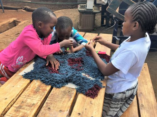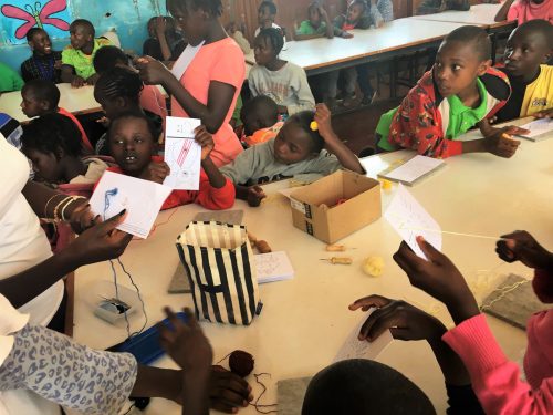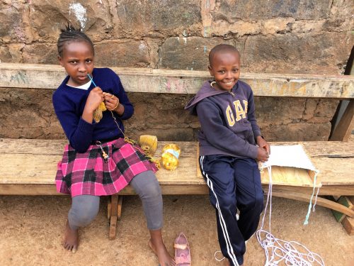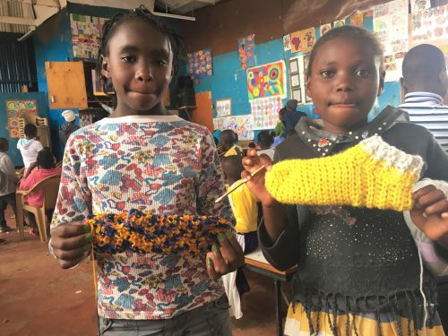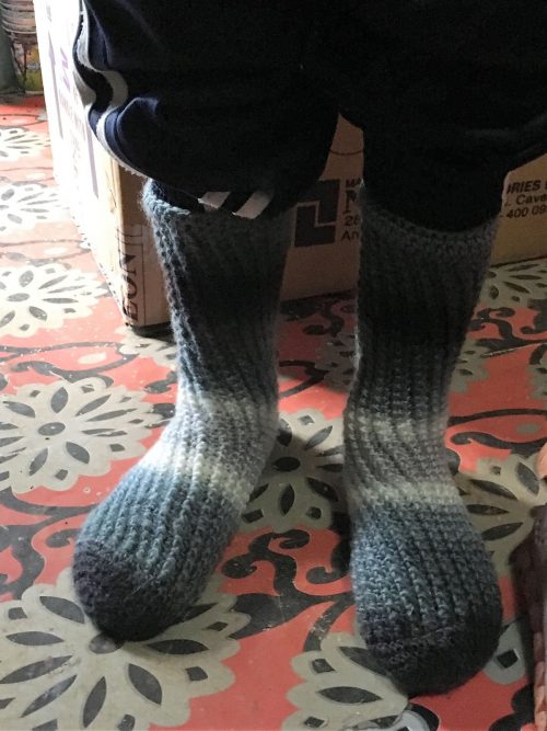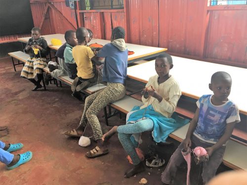 Einige der Kinder wollten wissen, wie man Socken machen. Da es für die Mehrzahl der Kinder deutlich einfacher ist, mit einer Häkelnadel umzugehen und das Stricken von Socken auf einem 5er-Nadelspiel erst mit einiger Strick-Erfahrung möglich ist, wurden verschiedene Häkelmodelle vorgestellt und mit viel Begeisterung nachgearbeitet.