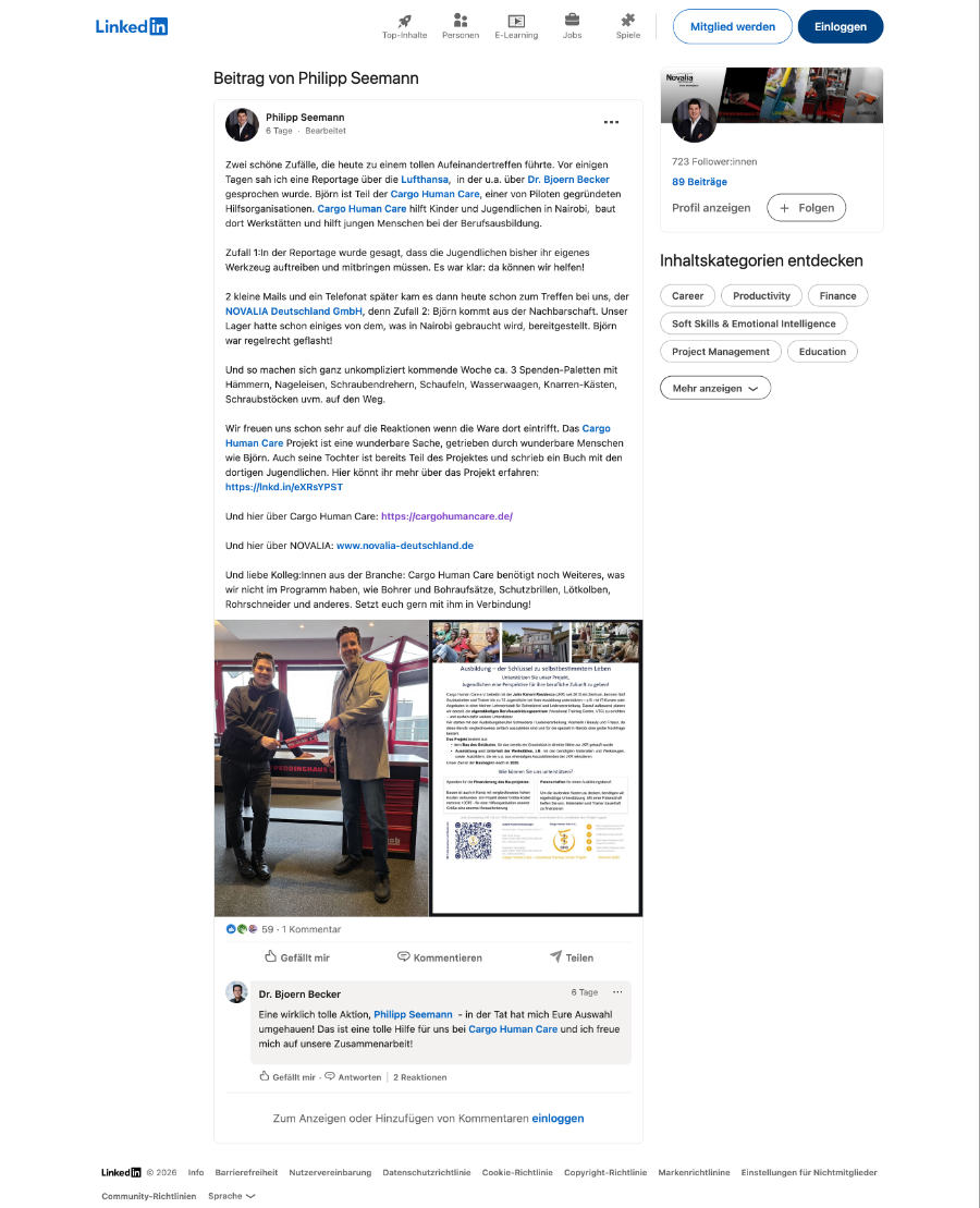 Also bin ich am 25. Januar nach Schwelm gefahren, um Philipp zu treffen und mögliche Partnerschaften zu besprechen. Vereinbart haben wir sehr konkret eine erste Lieferung, die wir noch im Februar nach Nairobi schicken können. Darüber hinaus möchten wir eine längerfristige Partnerschaft aufbauen, denn diese Werkzeuge helfen uns enorm und Novalia hat ein sehr konkretes soziales Projekt, das auch die MitarbeiterInnen begeistert, wie auch sein LinkedIn-Post nach unserem Treffen zeigt: Philipps LinkedIn Post
