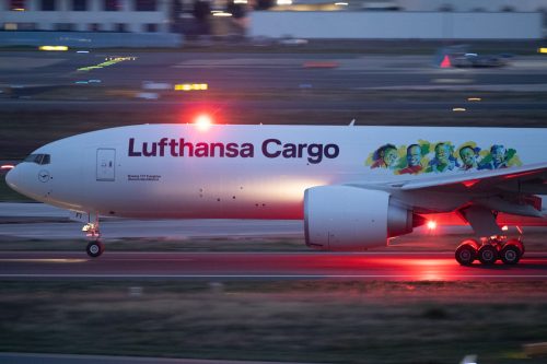 Nun operiert auch diese Triple-Seven im weltweiten Streckennetz der Lufthansa Cargo und trägt den Cargo Human Care Slogan in alle Erdteile.