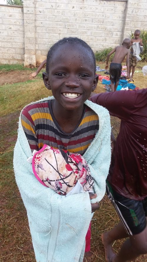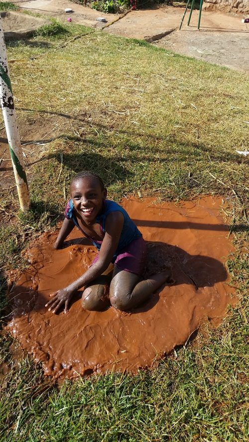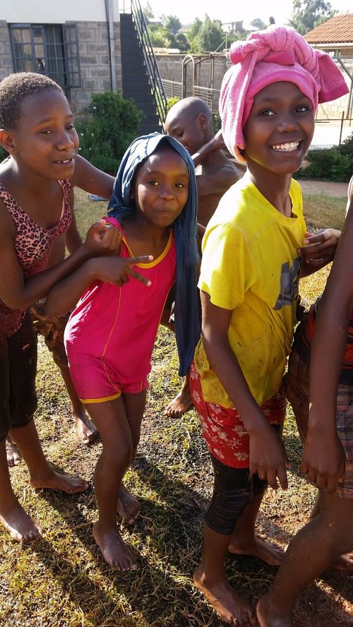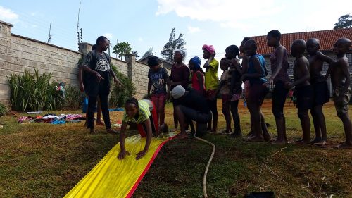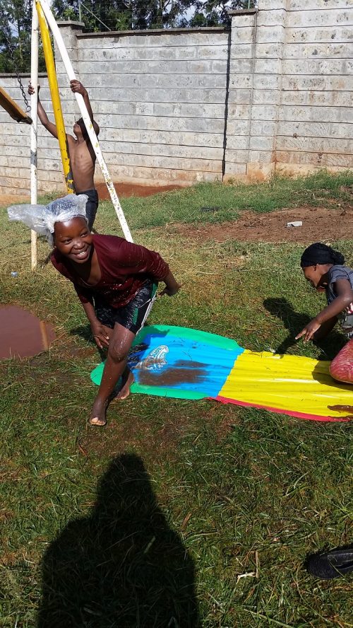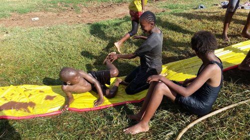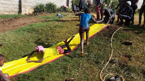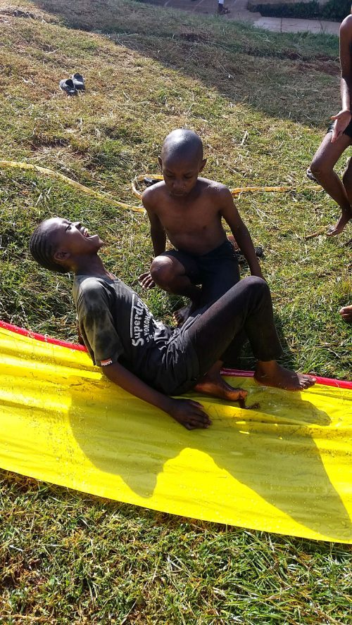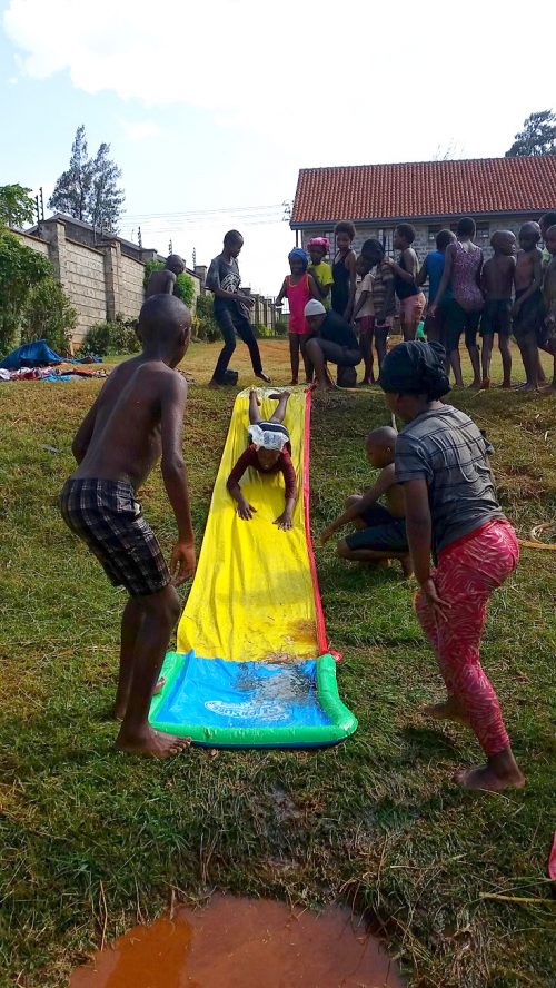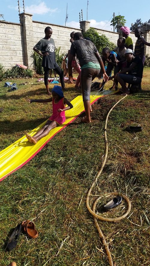 Wir haben seit etwa einer Woche Dank eines Spenders eine Wasserrutsche im Garten und Sonntags können wir sie eine Stunde nutzen.