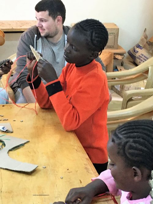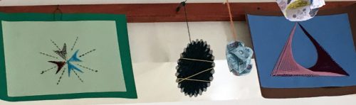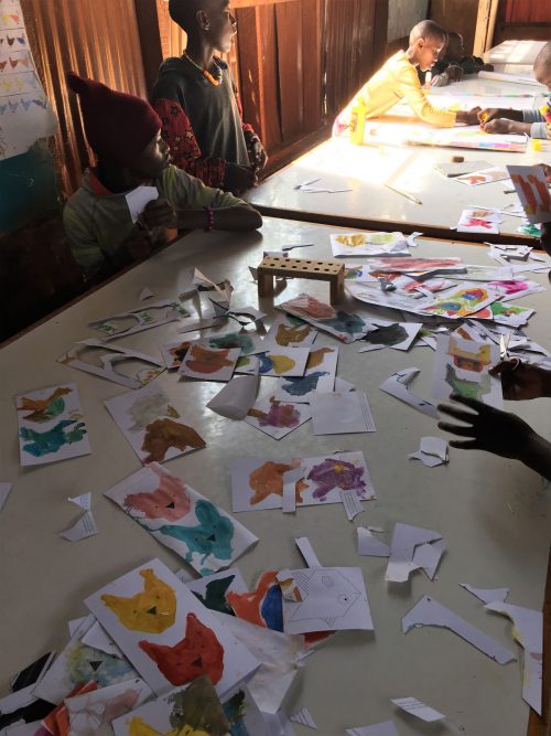 Im Juni waren Sieglinde Reinhard und Max Wiedenau für einige Tage im MMH, untern anderem, um für den August einen Ausflug mit zwei Museumsbesuchen vorzubereiten. Dabei gab es wieder Gelegenheit für Bastelarbeiten und gemeinsames Lesen mit den jüngeren Kindern. Gebastelt wurden einige Kachelbilder: Erst wurden Konturen von Hund, Katze, Vogel, Eule und Fisch mit Wasserfarben angemalt, dann wurden diese ausgeschnitten oder geprickelt und in bunten Mustern auf Wandpostern arrangiert. Außerdem wurden Untersetzer rundgewebt, es wurde gemalt und auch der Sport und Bewegung kamen nicht zu kurz.