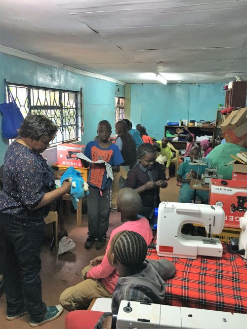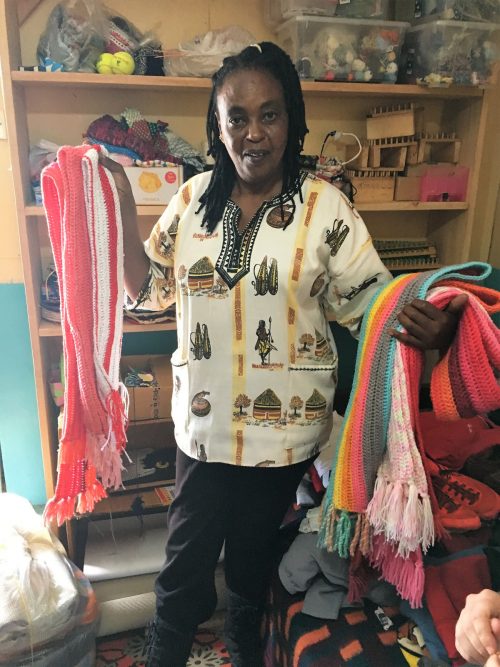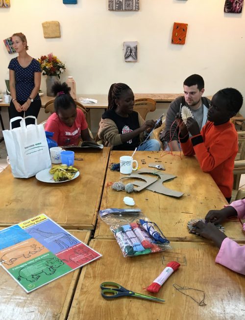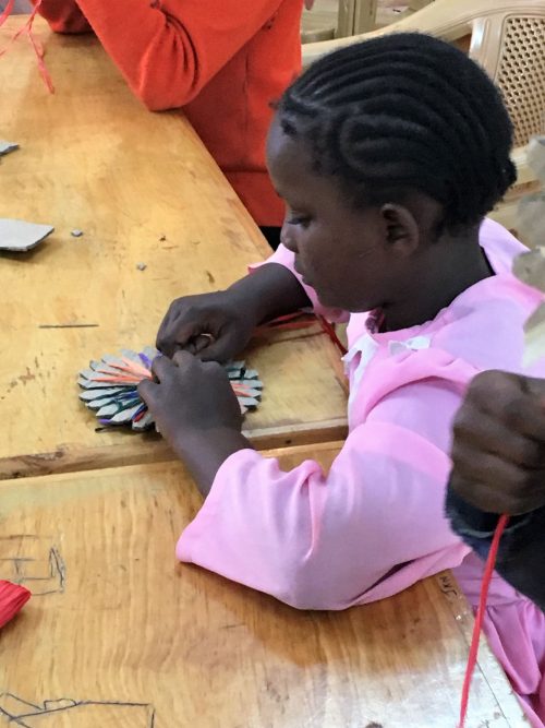Besonders gefreut hat es uns zu sehen, dass viele Ideen und Anregungen inzwischen eigenständig mit Hilfe des vorhandenen Materials umgesetzt werden. So wurden z.B. unter Anleitung der Social Worker und Volunteers vor Ort schöne Wollbilder zur Dekoration des neuen Aktivity-Raums gefertigt. Und Mother Mary hat mit einigen Kindern aus einer Wollspende sehr schöne Schals gemacht, die sie inzwischen auf zwei Veranstaltungen der Mothers Union zum Verkauf angeboten haben und so für ein kleines eigenes Einkommen sorgen. Als nächstes Projekt wurde das Knüpfen von kleinen Teppichen vorbereitet.