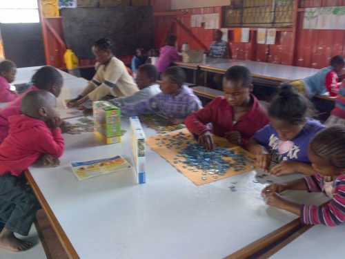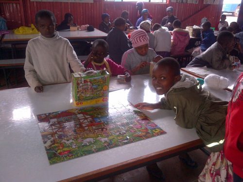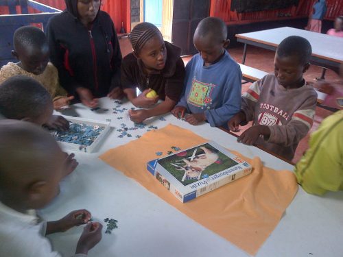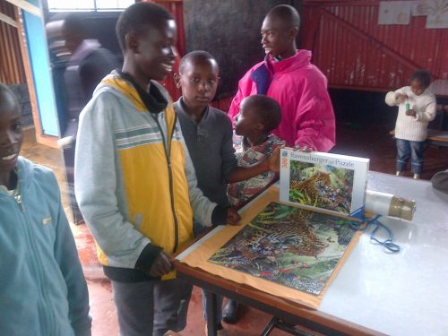 Nachdem mir beim letzten Besuch aufgefallen war, dass es einige Puzzle gibt, kam mir die Idee, selbstgebaute Puzzle-Roll-Matten mitzubringen. Die Kinder können die Puzzles nur an den Tischen in der großen Gemeinschaftshalle machen. Wenn es dann Essenszeit ist oder wenn die Geduld ausgeht, muss es eine Möglichkeit geben, halb-fertige Puzzle beiseite zu legen. Es hat mich sehr gefreut zu sehen, wie innerhalb von drei Tagen ein Puzzle mit 500 Teilen fertig gemacht wurde. Die Kinder und Jugendlichen hatten dabei so viel Spaß, dass sie gleich wissen wollten, ob wir noch ein weiteres Puzzle für sie haben. Jetzt, wo wir eine gute Möglichkeit gefunden haben, sich mit Puzzles zu beschäftigen, würden sich die MMH-Kinder sehr darüber freuen, wenn wir ihnen weitere Sets von 100, 300, 500, oder sogar 1000 Teilen zukommen lassen würden.