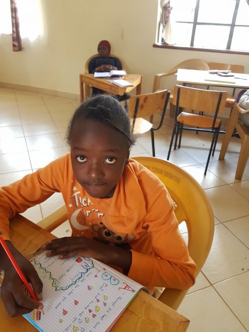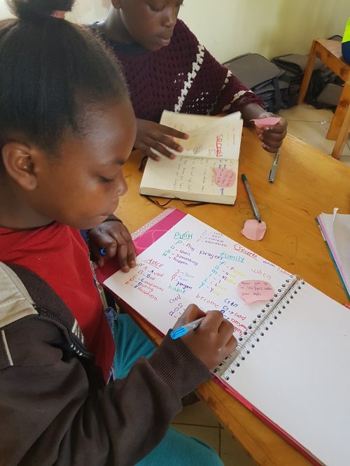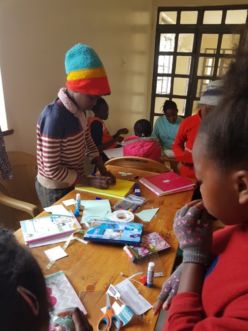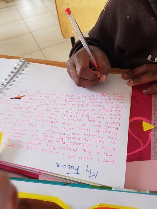 Zum Abschluss gestalteten wir noch Buchseiten zum Thema „My Future“. Wir malten, zeichneten und schrieben darüber, wie wir uns unsere Zukunft vorstellen. Wollen wir Kinder? Wollen wir in einem Haus leben? Wie wollen wir leben? Wollen wir Haustiere haben? Ich wollte die Kinder damit ein wenig motivieren, sich Gedanken zu machen, in welche Richtung ihr Weg gehen soll. Einige der Kinder waren sehr reflektiert und machten sich sofort an die Stifte. Andere taten sich etwas schwerer, wurden mit gezielten Fragen aber zum Nachdenken animiert.