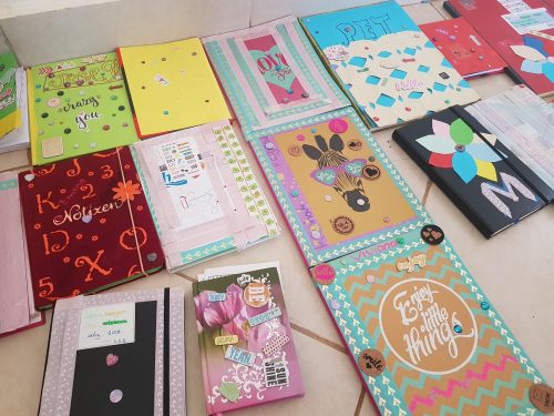 An jedem der fünf Workshop-Tage widmeten wir uns einem Thema intensiver. Am ersten Tag gestalteten wir das Cover, wir bastelten Blumen oder Scherenschnitte, klebten Sticker auf oder zeichneten auf ein buntes Blatt und klebten es um das Buch herum.