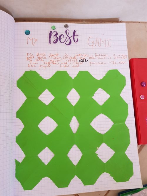 Wir schrieben kurze Texte über uns und unsere Familien, erstellten ein ABC mit unserem Lieblingsessen, schrieben über Lieblingsbücher und Lieblingsfußballspieler und die Kinder überzeugten dabei mit jeder Menge Kreativität. Sie zeichneten ihre Superhelden, malten die Logos ihrer Lieblingsvereine oder überlegten sich aus den Buchstaben ihres Vornamens jeweils eigene Wörter, die für ihr Leben an Bedeutung haben. Auch mit anderen Wörtern, etwa Familie oder Liebe gestalteten sie solche Wörter-Puzzles.