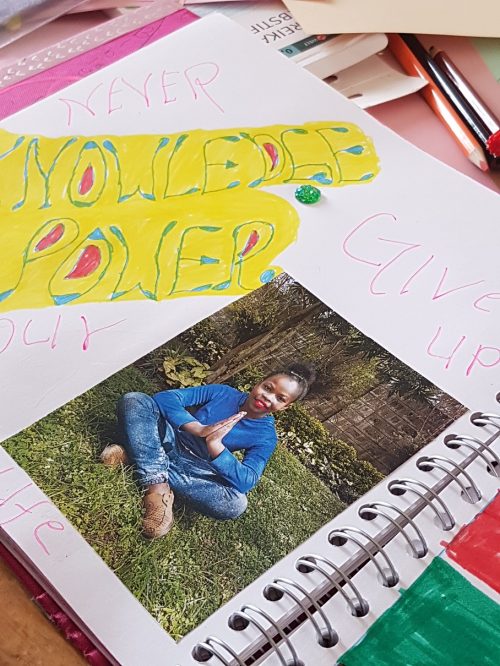 An den ersten vier Tagen hatten wir verschiedene Situationen genutzt, um Fotos von jedem Schüler zu machen. Ich hatte von jedem Kind vier Bilder entwickeln lassen, damit sie diese in ihre Bücher einkleben können. Die Kids hatten sich die ganze Woche darauf gefreut und so wurden die Fotos sorgsam zugeschnitten und eingeklebt. Drum herum wurden Zeichnungen und Collagen gefertigt, die Kinder konnten sich hier frei austoben.