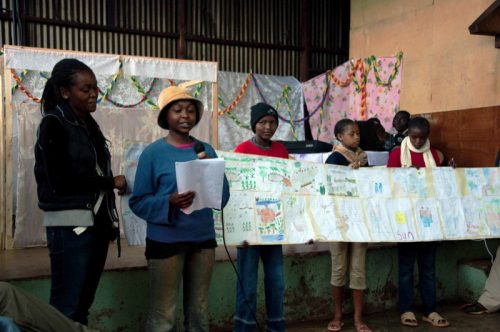 Wir haben gemeinsam die Abschlusspräsentation vorbereitet, drei Kinder ausgewählt, die sprechen sollten und die Zeichnungen auf Tapetenrollen geklebt. Und das Ganze am letzten Tag den anderen präsentiert.