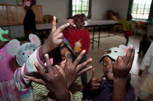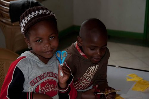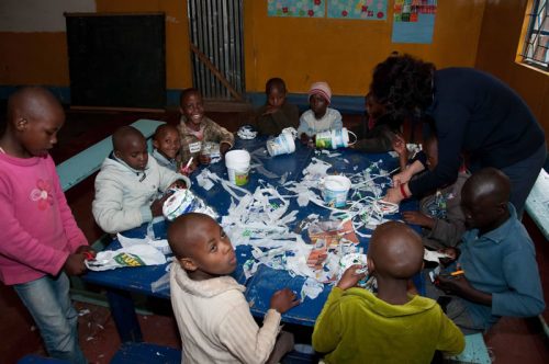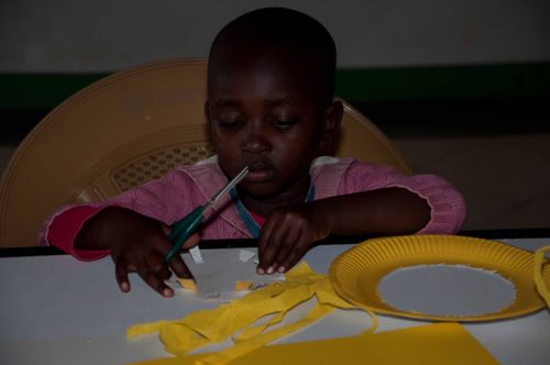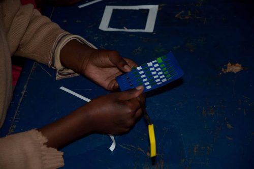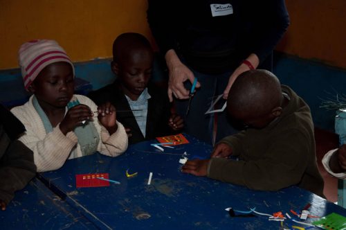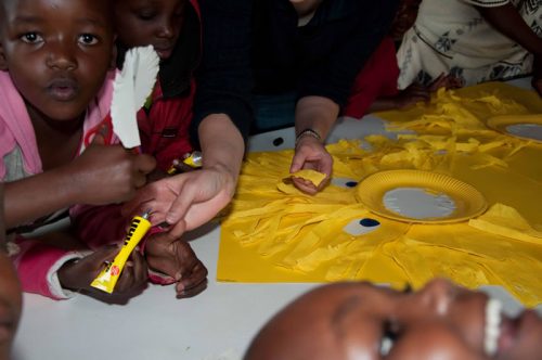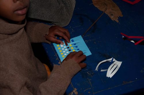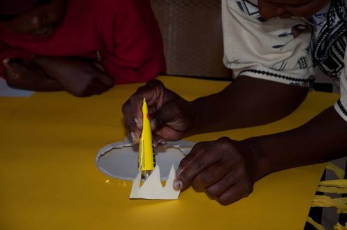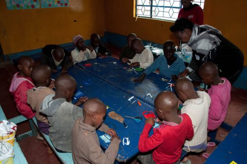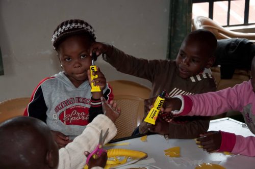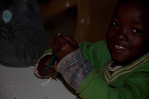 28 Augen blickten mich erwartungsvoll an, als ich am Sonntagnachmittag voller Vorfreude die Tür zum „commonroom“ öffnete. Die 13 jüngsten Kinder des MMH und Mother Grace hatten sich alle um den Tisch versammelt und hießen mich in dem allmorgendlichen Ritual herzlich willkommen. Die chorischen Kinderstimmen des „welcome, welcome Anna“ und das Klatschen dazu habe ich noch immer im Ohr. Anschließend beschäftigten sich die Kinder mit Schneidearbeiten und dem Punchen unterschiedlicher Tiere, die zuvor fantasievoll ausgemalt wurden. Auf diese Weise entstanden schöne Blumengirlanden und Bilder mit den aufgeklebten Tieren, welche den „commonroom“ sofort hübscher erscheinen ließen. Diese Tätigkeiten waren sehr hilfreich für die folgenden Bastelarbeiten, die wir im Laufe des Summercamps durchführten.