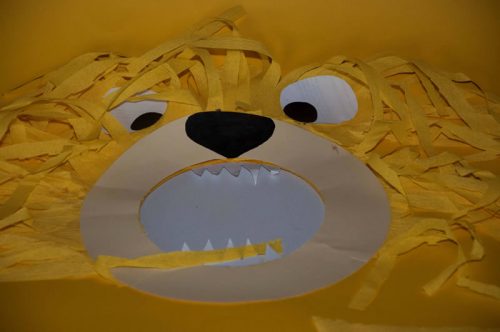 Am Montagmorgen bastelten wir das „Löwenspiel“. Hierzu wurde in einen gelben DIN A2-Bogen ein Loch geschnitten – für das Maul des Löwen. Zudem benötigten wir Augen, Zähne und nicht zu vergessen die Löwenmähne, welche aus Krepppapier auf den Karton aufgeklebt wurde. Nach getaner Arbeit tobten sich die Kinder in theaterpädagogischen Spielen aus, z.B. das Katz-und Maus-Spiel, bei welchem eines der Kinder die Katze ist und versuchen muss, die anderen Kinder, welche die Mäuse sind, zu fangen. Hat die Katze eine Maus erwischt, müssen sie zusammen, sprich sich an den Händen haltend, weiter auf Mäusejagd gehen.