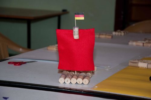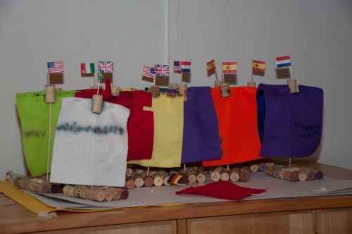 Am Dienstagmorgen bastelten wir zusammen kleine Boote aus Kork. Während eine Gruppe der Kinder zuerst die Boote aus Kork zusammenklebte, bastelten die anderen ihre Segel aus Filz, Zahnstochern, Schaschlikspießen und zu guter Letzt setzten sie eine kleine Flagge auf die Spitze des Segels. Anschließend tauschten die Kinder die Plätze, um das fehlende Gegenstück zu basteln.