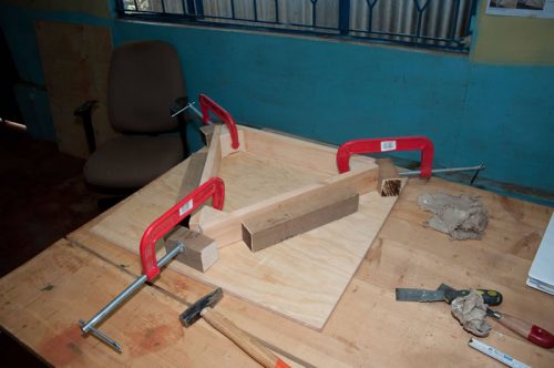 Aber ich benötigte auch Vorlaufzeit um 2 Webrahmen fertigzustellen, damit sie in Sieglindes Workshop benutzbar waren. Spontan haben mir dabei einige Kinder geholfen, die nicht Teilnehmer des kommenden Holzworkshops waren. Sie mussten dabei lernen, mit einem Dübelwerkzeug umzugehen. In der Summercampwoche kamen am Nachmittag spontan Moses und Paul (Teilnehmer des Bücherregalbauteams vom Okt. 2010) dazu. Moses entdeckte dabei die von mir mitgebrachte Schleifscheibe, die ich besorgt habe, um abgebrochene Bohrer wieder benutzbar zu machen. Er kam dann mit einem Stapel Messer aus der Küche, um diese zu schärfen. Im „Hofladen“ steht inzwischen ein Holzregal, welches Moses und andere Woodies im Laufe des Jahres gebaut haben. Das macht dann Freude, zu sehen, dass die Holzwerkstatt so gut angenommen wird. Wir haben dann noch das alte eiserne und kaputte Untergestell der Tischtennisplatte entsorgt, vom Schreiner David 3 stabile Böcke als neues Untergestell herstellen lassen, sodass die Tischtennisplatte nun auch wieder benutzbar ist.