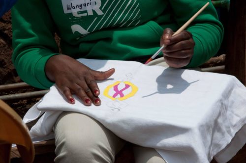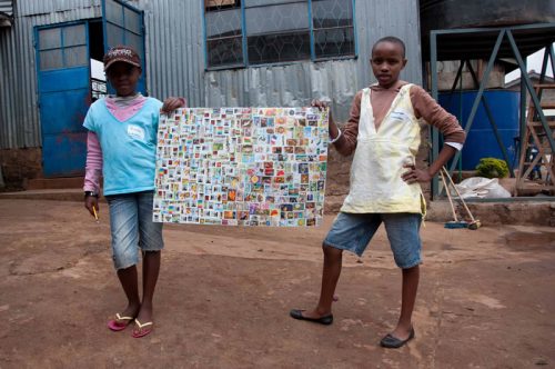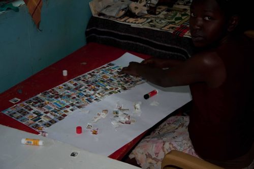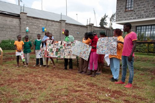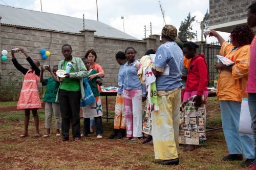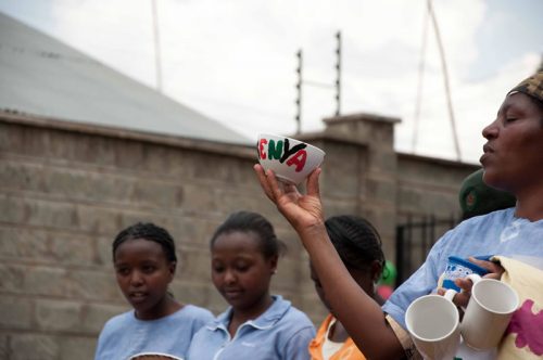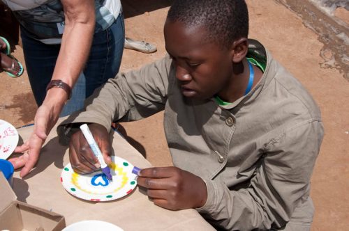 Die Kinder und Jugendlichen im MMH zeichnen und malen sehr gerne. Sie brauchen keine Vorlagen oder Schablonen sondern lassen ihrer Phantasie freien Lauf. Zunächst hatten wir überlegt, Blumentöpfe aus Ton mit Stoffresten und Farbe zu gestalten und diese im MMH Souvenirshop zu verkaufen. Im Vorfeld des Summercamps, hat sich Mother Leah über die Preise von einfachen Tonblumentöpfen informiert. Sie sind im Verhältnis zu anderem Material sehr teuer, da es zum Großteil Importware ist. Daher setzten wir die nächste Idee um und besorgten schlichte weiße Dessertteller, Tassen, Schüsseln aus weißer Keramik um diese mit Porzellanmalfarben zu verschönern. Für die größeren Kinder besorgten wir Porzellan- Farben auf Wasserbasis in kleinen Gläsern und Acrylpinsel von unterschiedlicher Stärke. Die kleineren Kinder kamen mit Porzellan-Malstiften zunächst besser zurecht. Diese werden wie Filzstifte gehandhabt, sind lösungsmittelfrei und geruchsneutral. Die Farbpalette hat die 14 TeilnehmerInnen des Workshops am meisten beeindruckt. Damit jede/r einmal die jeweilige Lieblings Farbe für „sein Werk“ benutzen konnte, bildeten die Kinder kleine Teams und rotierten untereinander. Die Jüngeren erhielten Unterstützung von den Älteren, die ihnen bei der Pinselführung halfen oder den Keramikbecher auf der richtigen Höhe hielten, damit bspw. eine Bordüre fertig gestaltet werden konnte. Mother Leah und Teacher Hildah wussten genau, an welcher Stelle ihr Wissen und ihre praktische Anleitung benötigt wurden. Sie gaben dies weiter – überließen es aber den Kindern, ihr Werk selbständig fertig zu bringen.