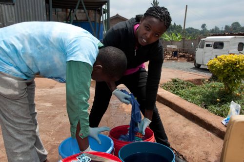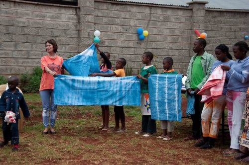 Der Batik Workshop vom letzten Jahr fand viele Anhänger, sodass Mother Leah und ich beschlossen hatten, auch in diesem Jahr einen Tag dafür einzuplanen. Mit einer Auftragsarbeit aus Deutschland – ein Set Bettwäsche zu batiken – starteten wir. Die Herausforderung bestand darin, den Bettbezug und das Kopfkissen mit dem gleichen Muster = „Pattern“ zu versehen. Das war unser Anspruch! Unter Anleitung von Mother Leah und Nählehrerin Hildah gelang es den Kindern, zunächst durch gleichmäßiges abbinden der Stoffbahnen, die Grundlage für das Muster zu geben. Danach wurden beide Teile in einen 10l Eimer mit heißem Wasser eingetaucht, indem sich das dunkelblaue Batikpulver zwischenzeitlich aufgelöst hatte. Unter gleichmäßigem Umrühren begann nun der Färbeprozess. Er dauert, je nachdem wie intensiv die Farbgebung sein soll, zwischen 10- 20 Minuten. Abschließend werden die Stoffe in kaltem Wasser unter Zusatz von hellem Essig solange ausgespült, bis das Wasser klar ist. Zum Schluss kam das Werk auf die Wäscheleine und wurde von vielen bestaunt.
