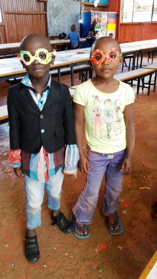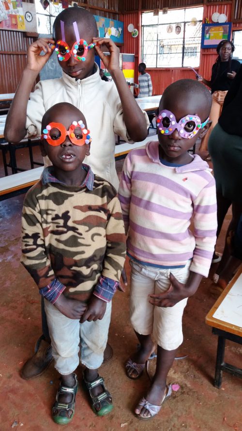Der erste angebotene Workshop wurde natürlich mit großem Eifer und Engagement wahrgenommen. Jedes Kind konnte sich mit diversen zur Verfügung gestellten Materialien eine eigene Brille basteln. Die Ergebnisse konnten sich sehen lassen. Besonders schöne Exemplare entstanden mit Resten aus Lametta und Pompons. Manche Kinder suchten auch noch durchsichtige Folie um „richtige“ Brillengläser einzufügen. Der Phantasie waren keine Grenzen gesetzt.