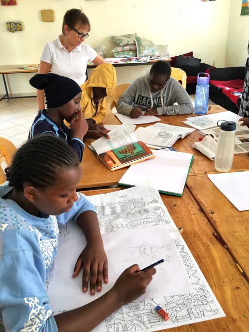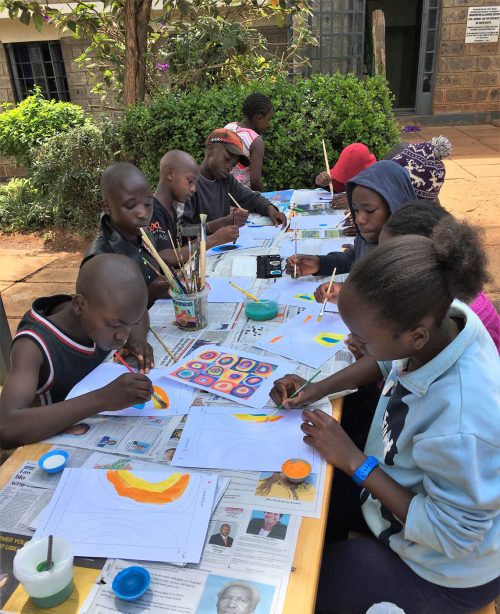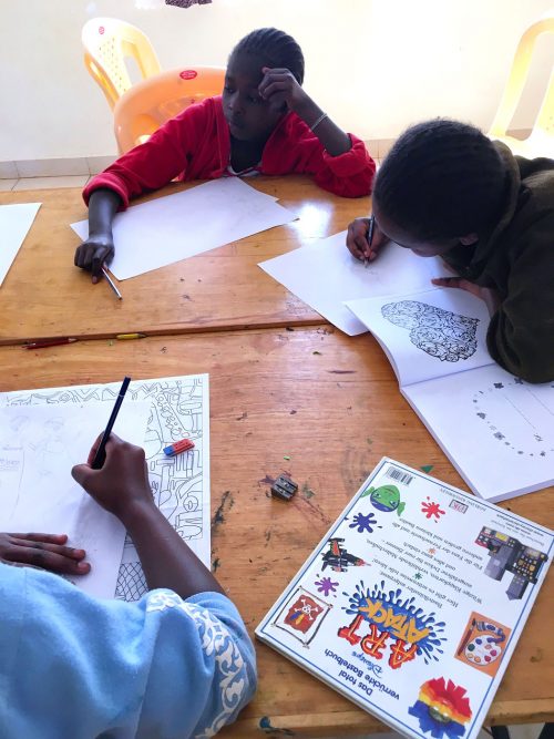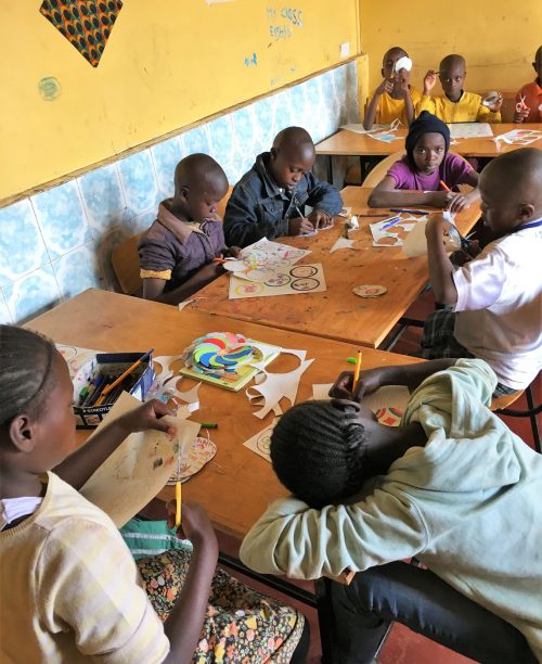 In mehreren Teams wurde der richtige Umgang mit Wasserfarben weiter vertieft. Mit einigen besonders talentierten Kindern konnte Marlies Wiedenau, die in Deutschland als Lehrerin u.a. für Kunst arbeitet, weitergehende Mal-Techniken vorstellen und einüben. Das wurde von der Gruppe mit so viel Interesse und Begeisterung aufgenommen, dass wir daran bei weiteren Besuchen in jedem Fall anknüpfen werden.